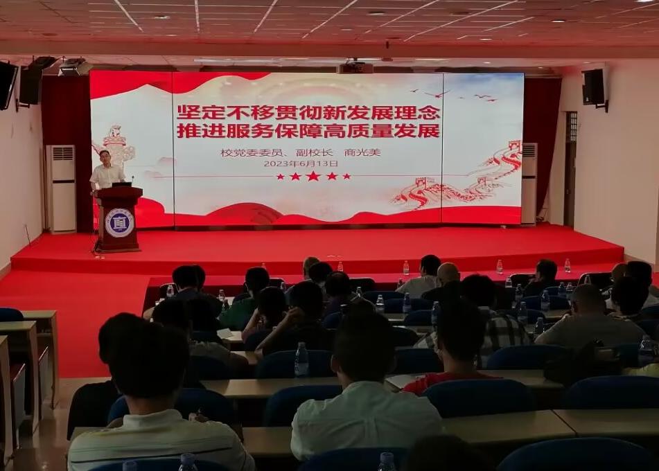 商光美副校长以《坚定不移贯彻新发展理念,推进服务保障高质量发展》为题,围绕新发展阶段要求高质量发展、以新发展理念引领高质量发展、以新发展格局推动高质量发展、加快构建服务保障高质量发展新格局等四个方面,结合主题教育期间自身开展理论学习和调查研究的收获和体会,进行深入浅出的解读阐释。